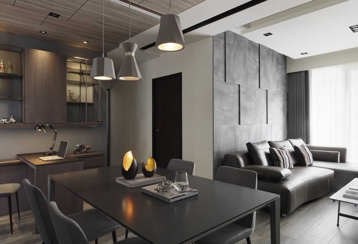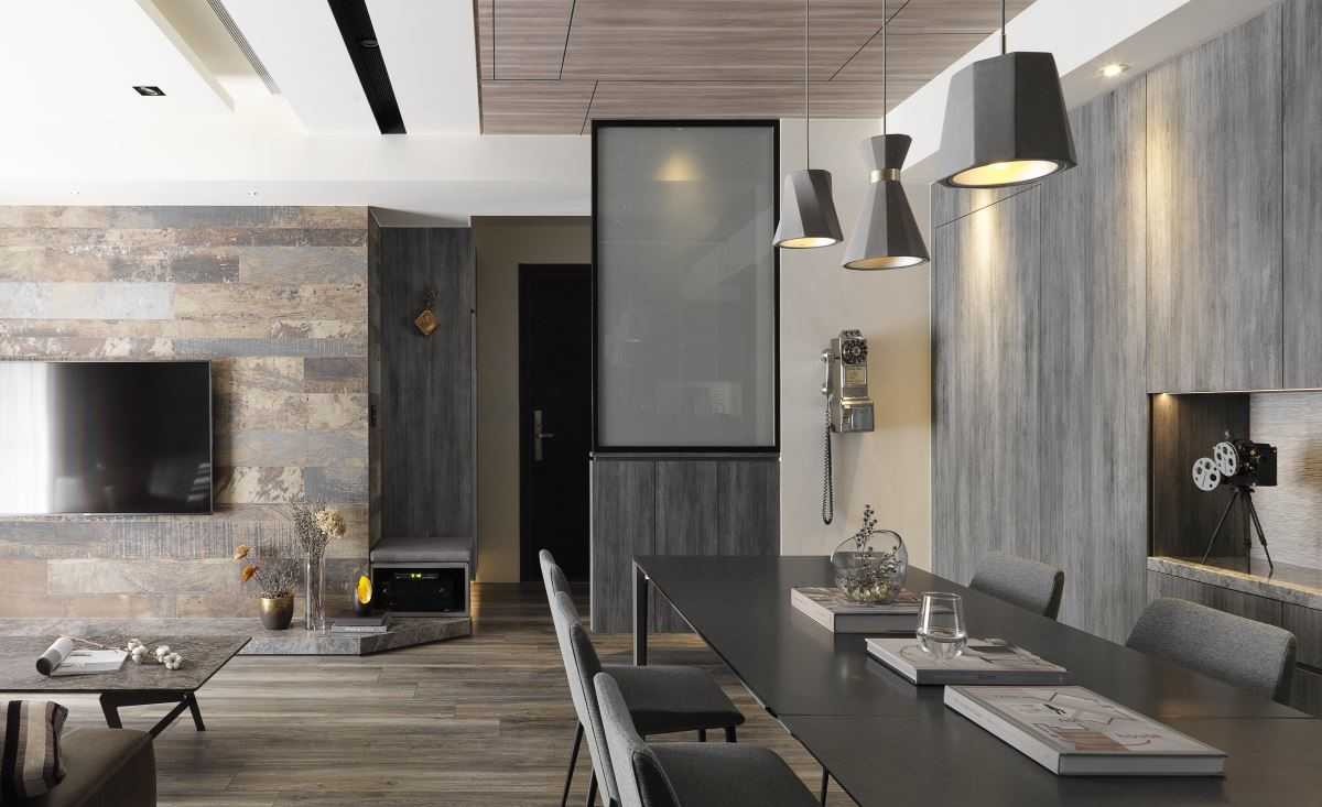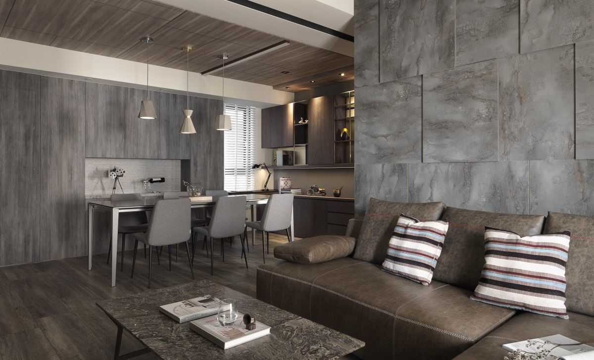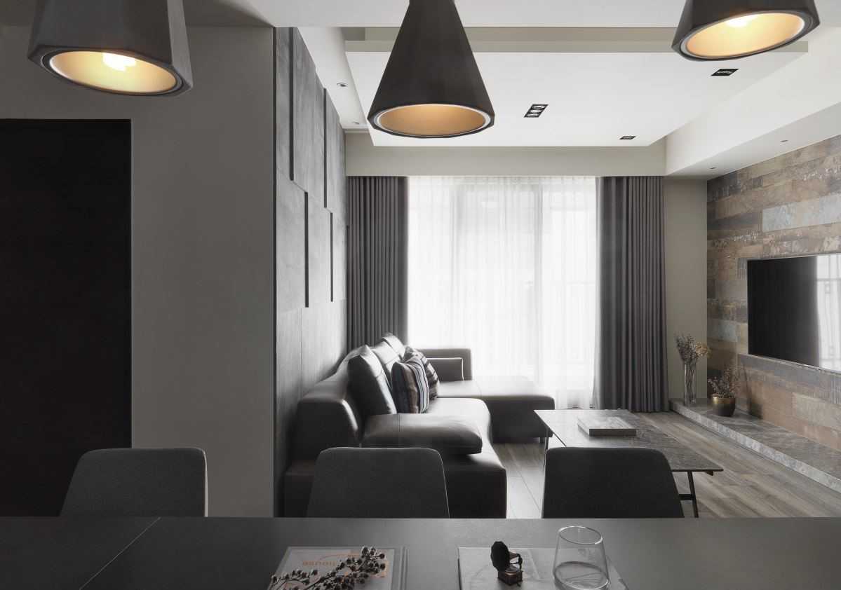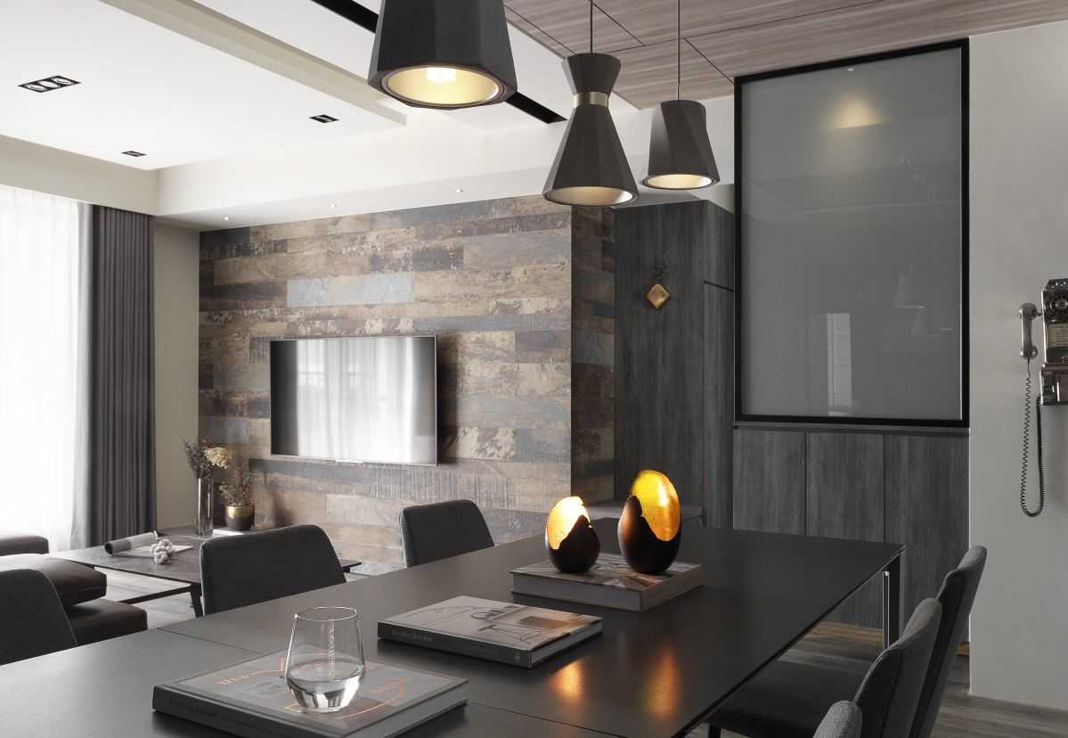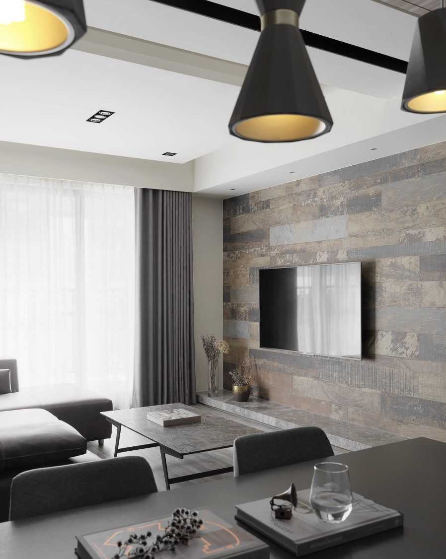 公領(lǐng)域地坪的仿舊木紋磚、復(fù)古味十足的電視墻以及深灰質(zhì)感的特殊立面質(zhì)材,讓同色系的視覺空間堆疊出細(xì)節(jié)層次,而幾盞有暖度的黃光特色燈具,加乘了居家生活氛圍與特色。