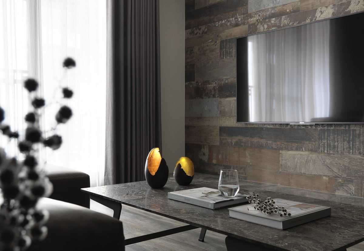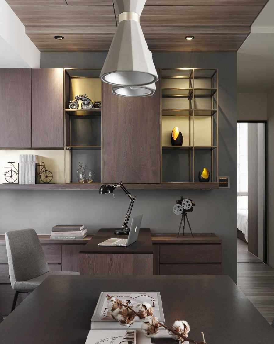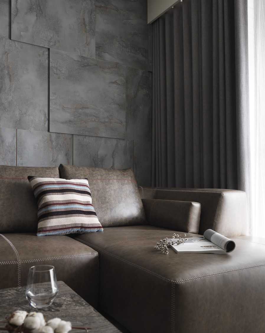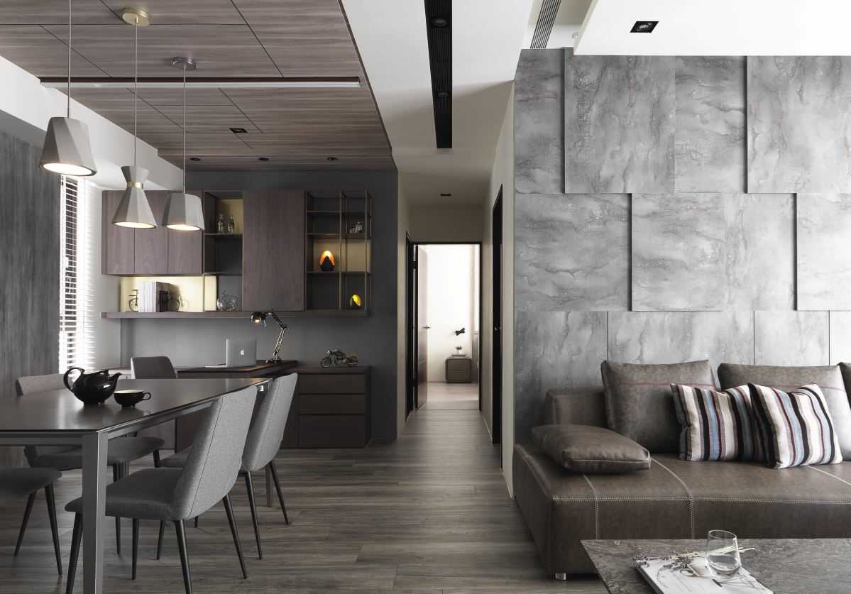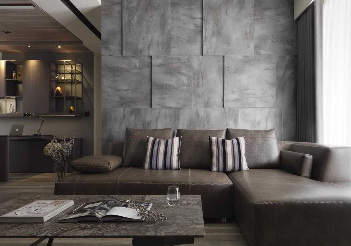 公領(lǐng)域地坪的仿舊木紋磚、復(fù)古味十足的電視墻以及深灰質(zhì)感的特殊立面質(zhì)材,讓同色系的視覺空間堆疊出細(xì)節(jié)層次,而幾盞有暖度的黃光特色燈具,加乘了居家生活氛圍與特色。
