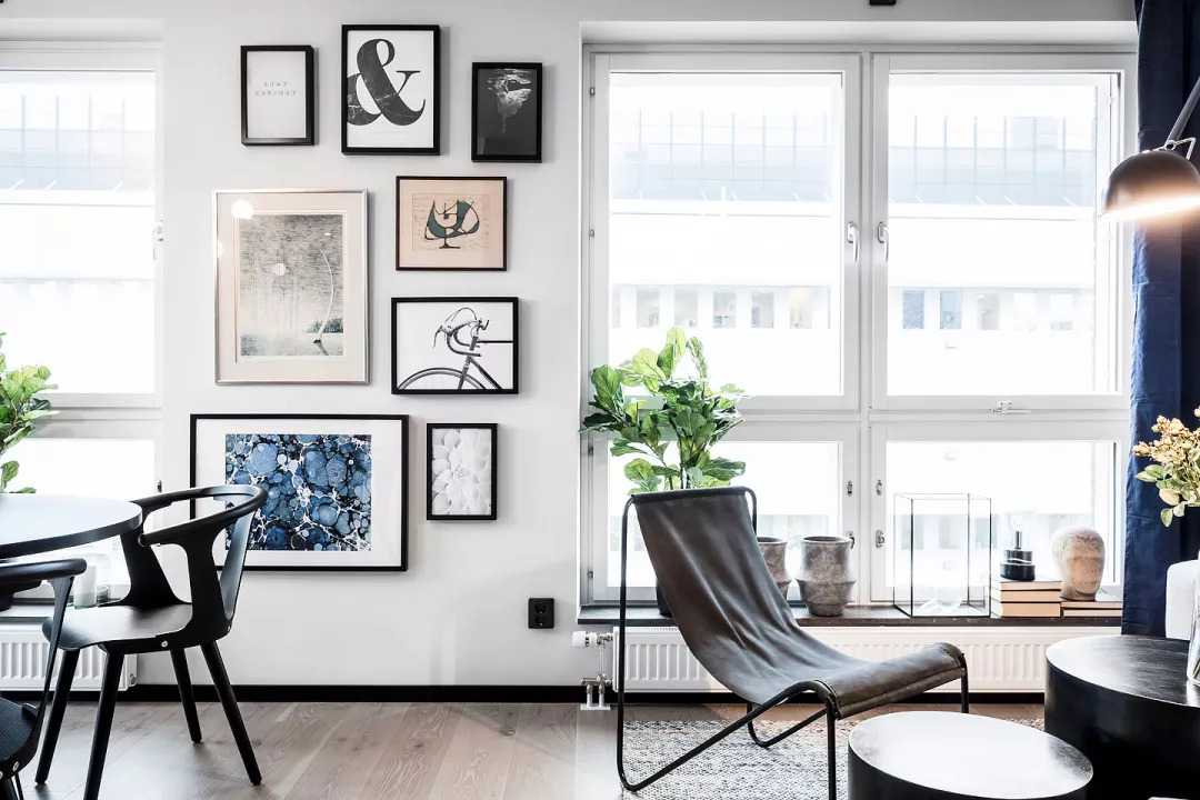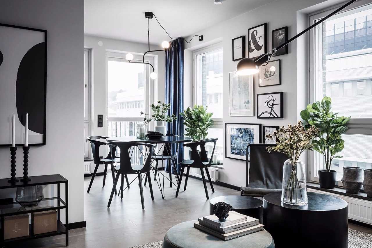 藍色配飾面向黑色細節(jié)與海報的拼貼畫混合了跳蚤小說天花板燈,黑色餐桌,椅子在之間和傳統(tǒng)通過結(jié)合開放式解決方案中的顏色,房間被認為更大且連貫。
