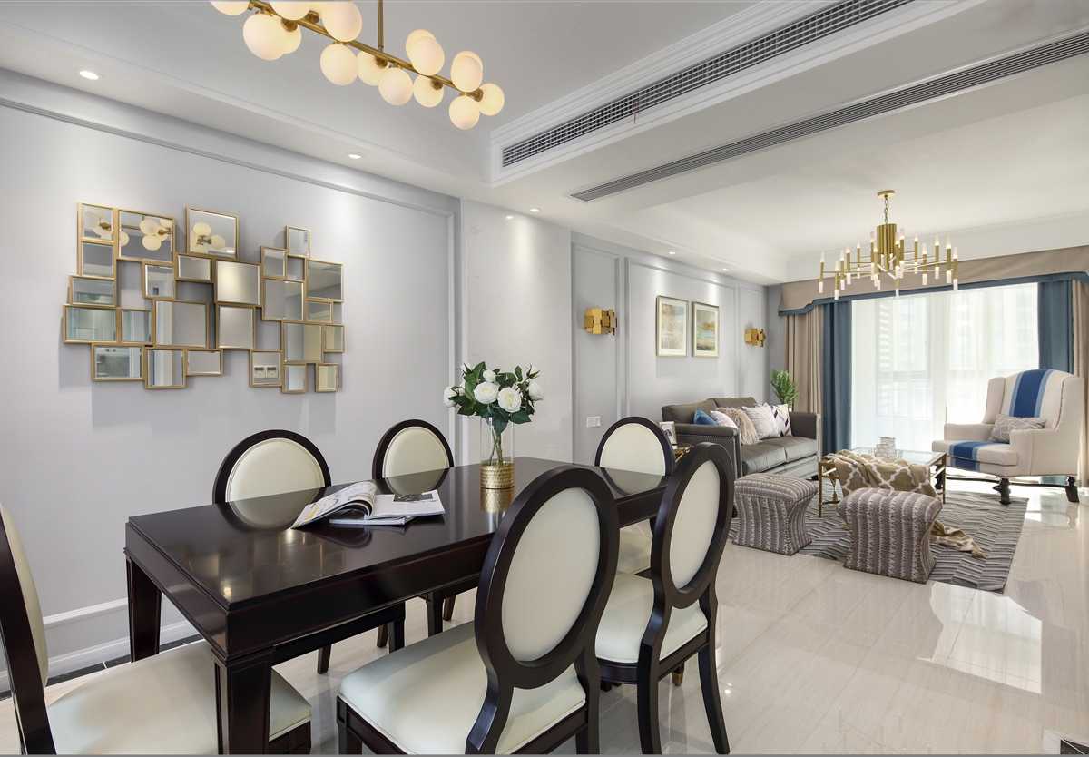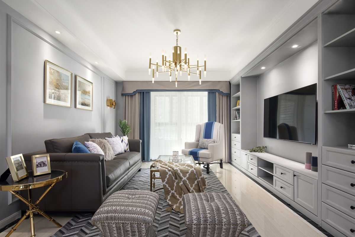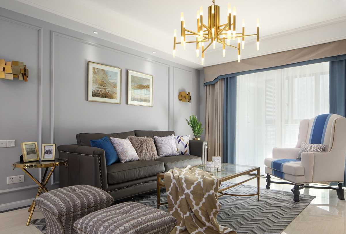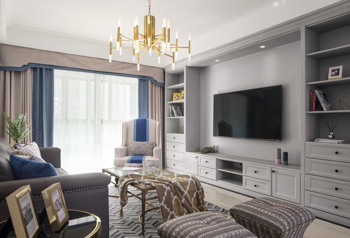 灰色的護(hù)墻板和兼具儲(chǔ)物柜功能的電視背景墻搭配金色的家具,低調(diào)與奢華相互平衡,帶來別樣的美式感受。柔美的藍(lán)色點(diǎn)綴其中,打破了美式的陳舊的同時(shí)也豐富了客廳空間的色彩。