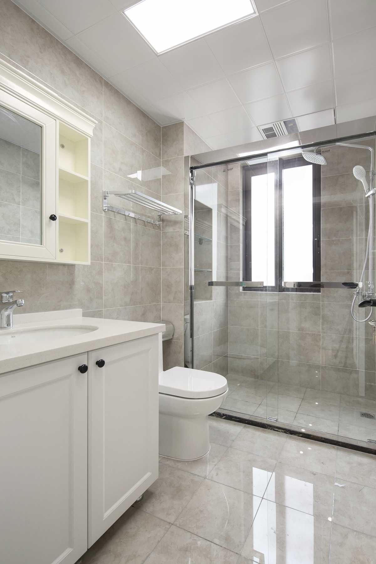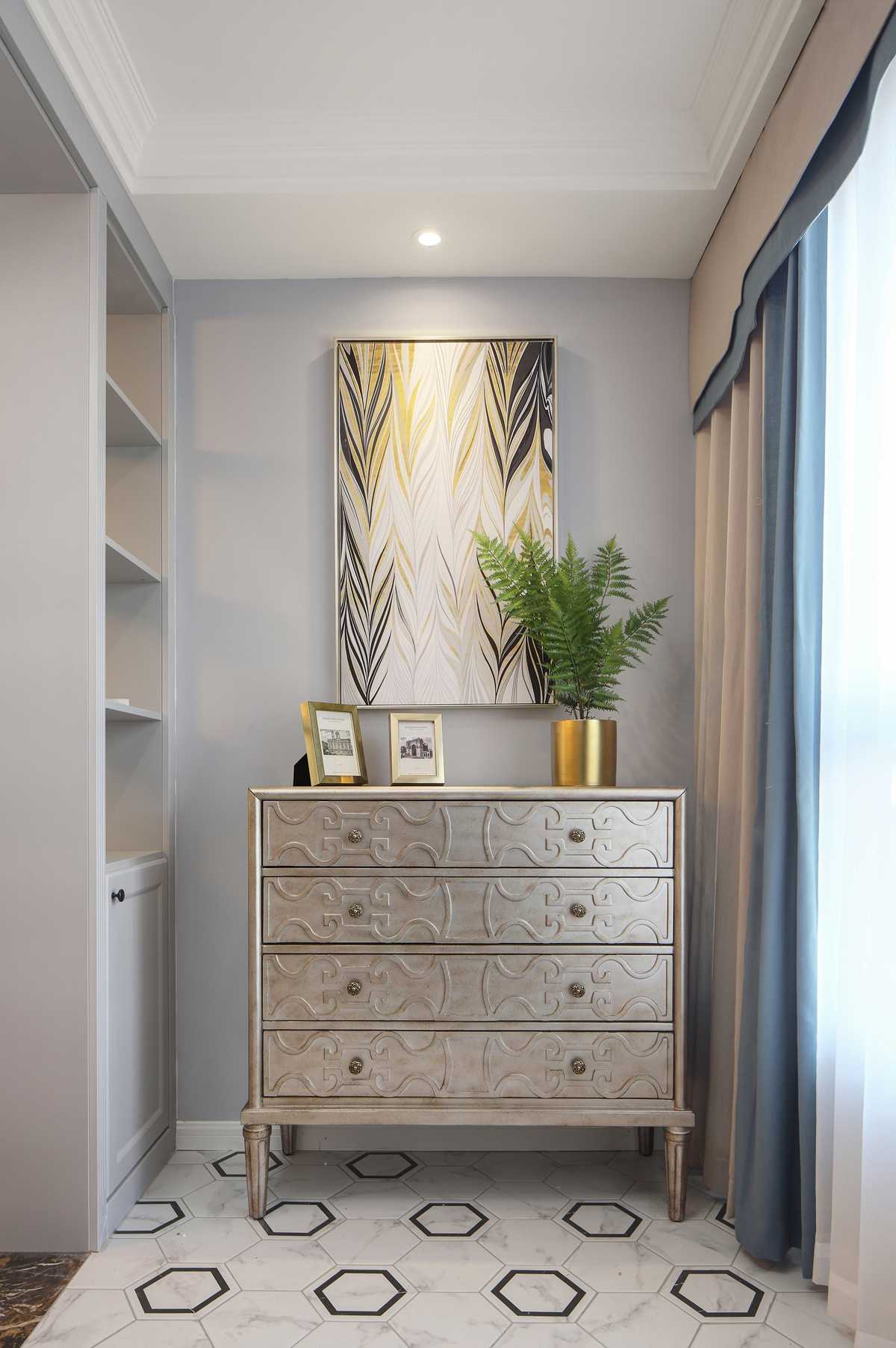 淺色系幾何圖案壁紙,襯托出美式家具的質(zhì)感。柔和的主臥色彩給人以舒適的視覺感受,床品也以舒適為主,體現(xiàn)輕奢美式的細(xì)節(jié)。
