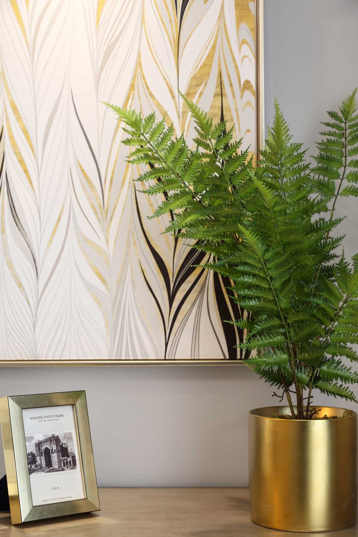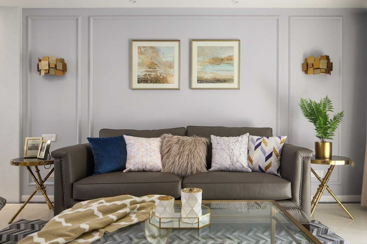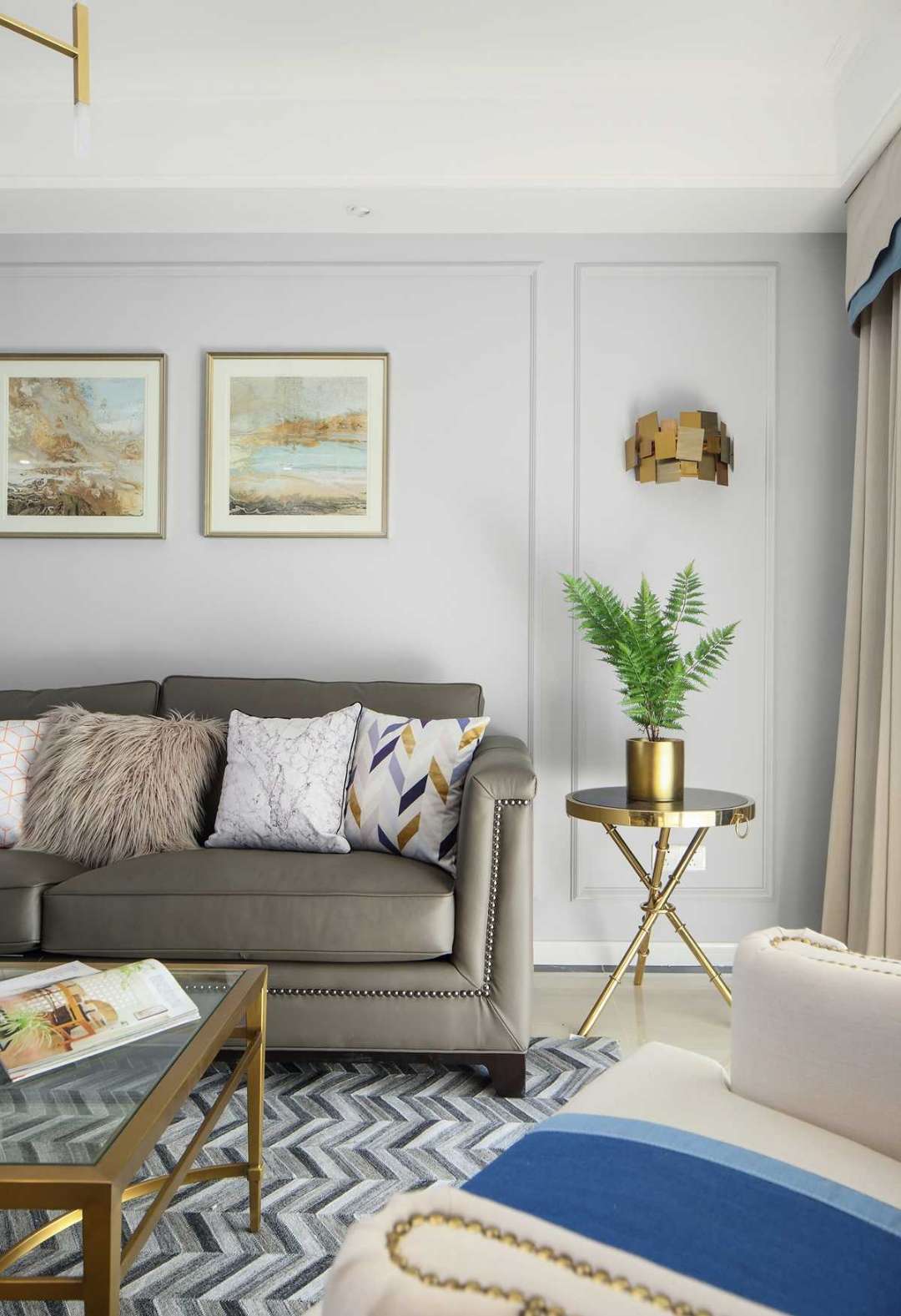 在沙發(fā)背景墻這邊,設(shè)計(jì)師并沒有像傳統(tǒng)美式那樣,用多么復(fù)雜的造型,只是以簡(jiǎn)單的線條劃分,金色和灰色的搭配,整體大氣簡(jiǎn)約符合當(dāng)下年輕人的審美。