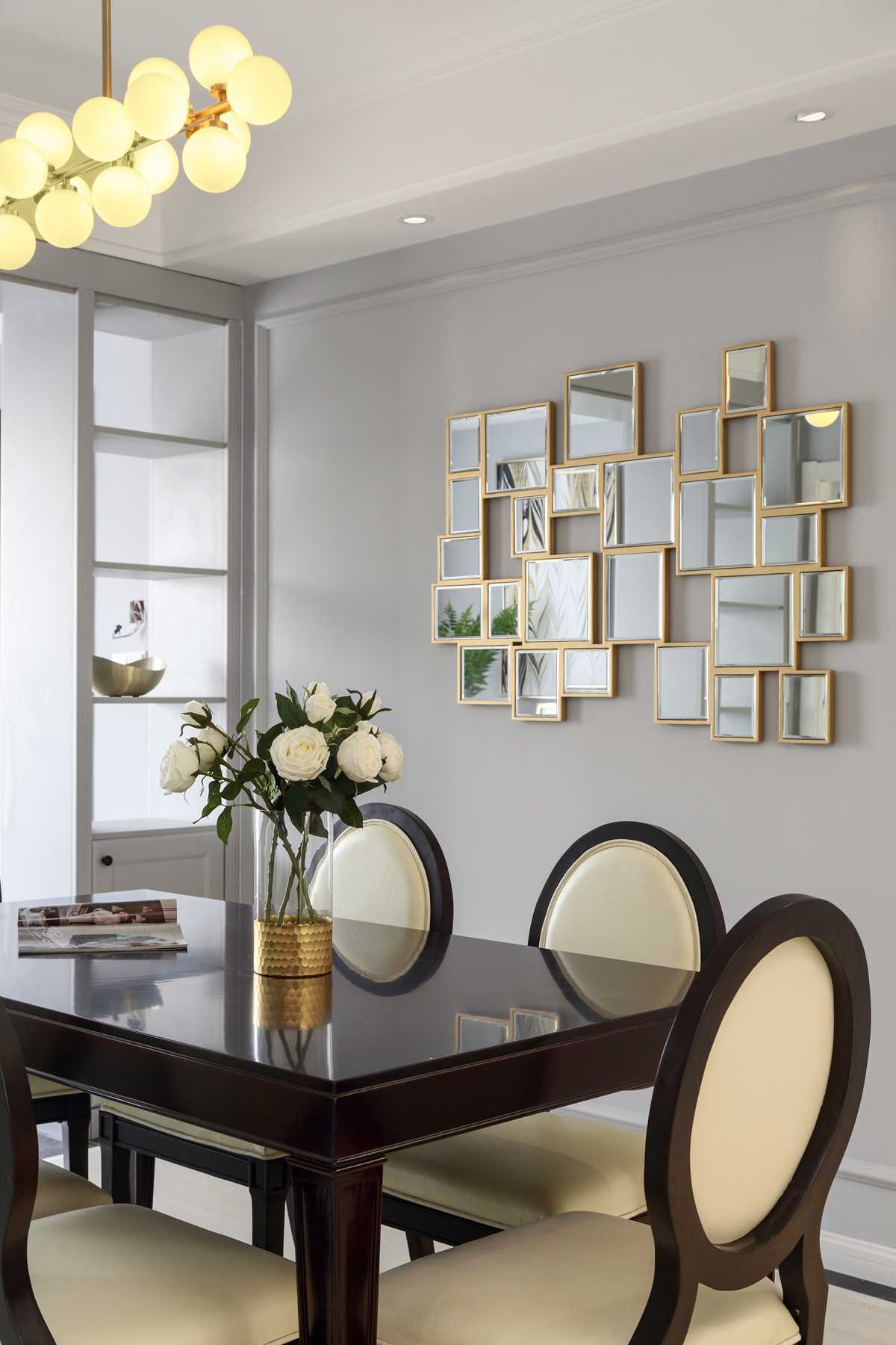 餐廳與客廳間沒有影響采光的隔斷,以吊頂和背景墻來劃分不同的功能區(qū)域,從視覺上拓寬了餐廳的視野。金屬邊框的不規(guī)則鏡子,活躍了氛圍的同時(shí),點(diǎn)亮了單調(diào)的背景。