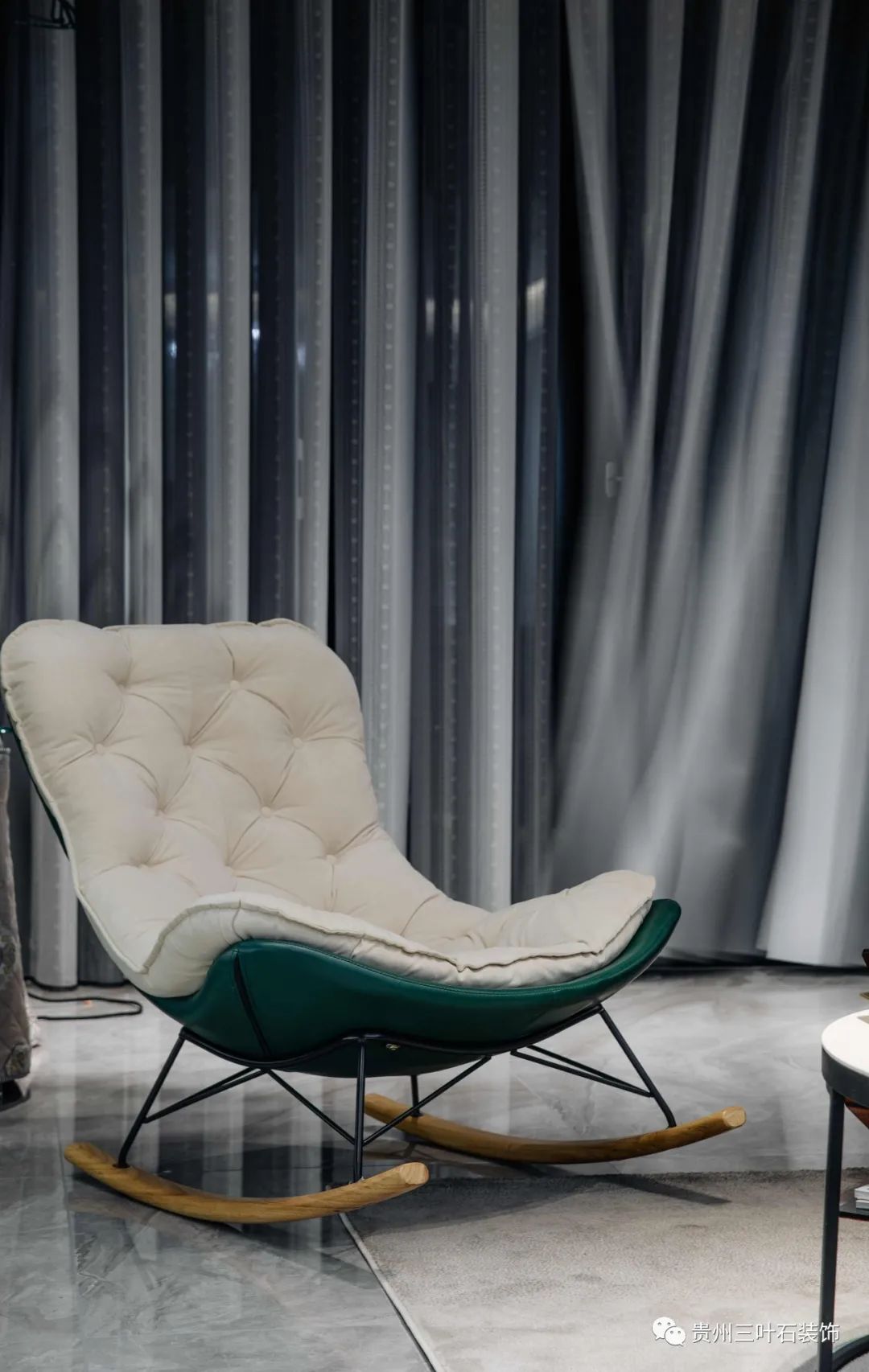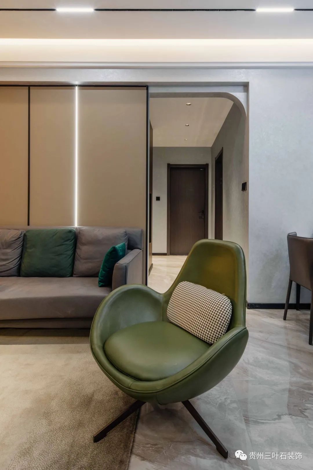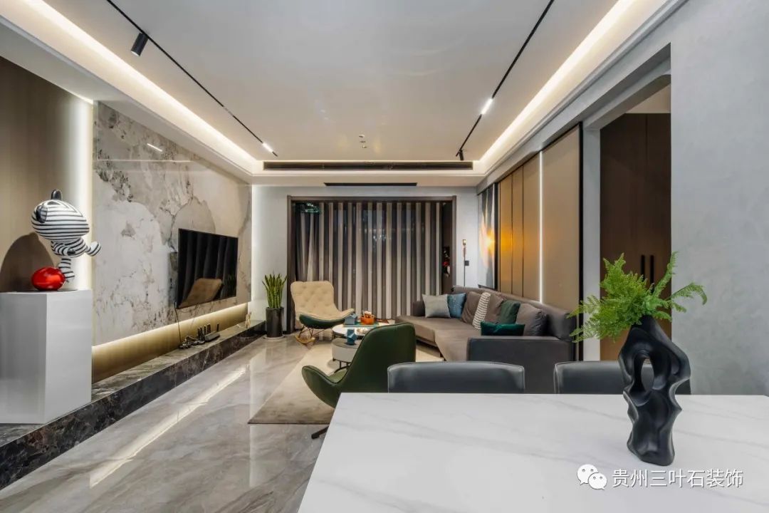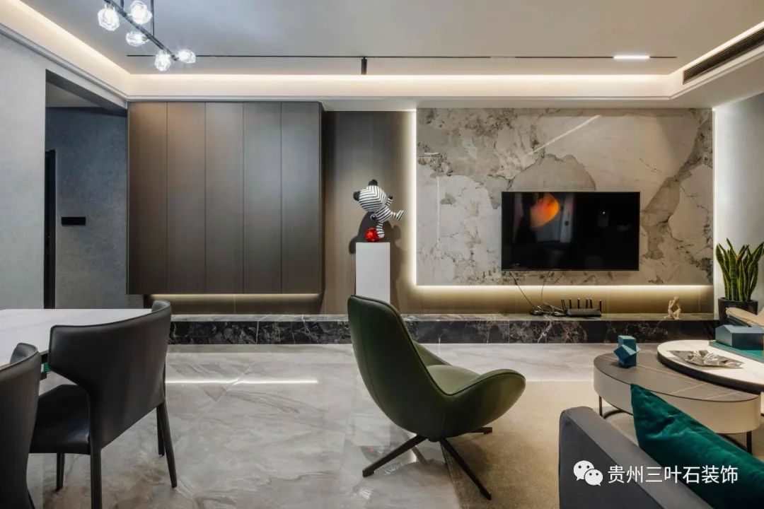 采取無主燈設計,吊頂做磁吸軌道燈,黑色極窄軌道簡潔,增加空間流動感,同時在吊頂中暗藏燈帶作為間接照明。主燈由三盞簡燈代替,防眩暈簡燈,光線柔和減少常規(guī)簡燈射燈刺眼的問題,盡可能節(jié)省層高空間營造出寬敞開闊的視覺感受。用純熟的線條技巧讓空間顯得利落輕盈,不同的墻面材質豐富視角感官。搭配墨綠色的皮藝單人椅搭配灰色系毛絨地毯,奠定空間整體的沉穩(wěn)高級基調。