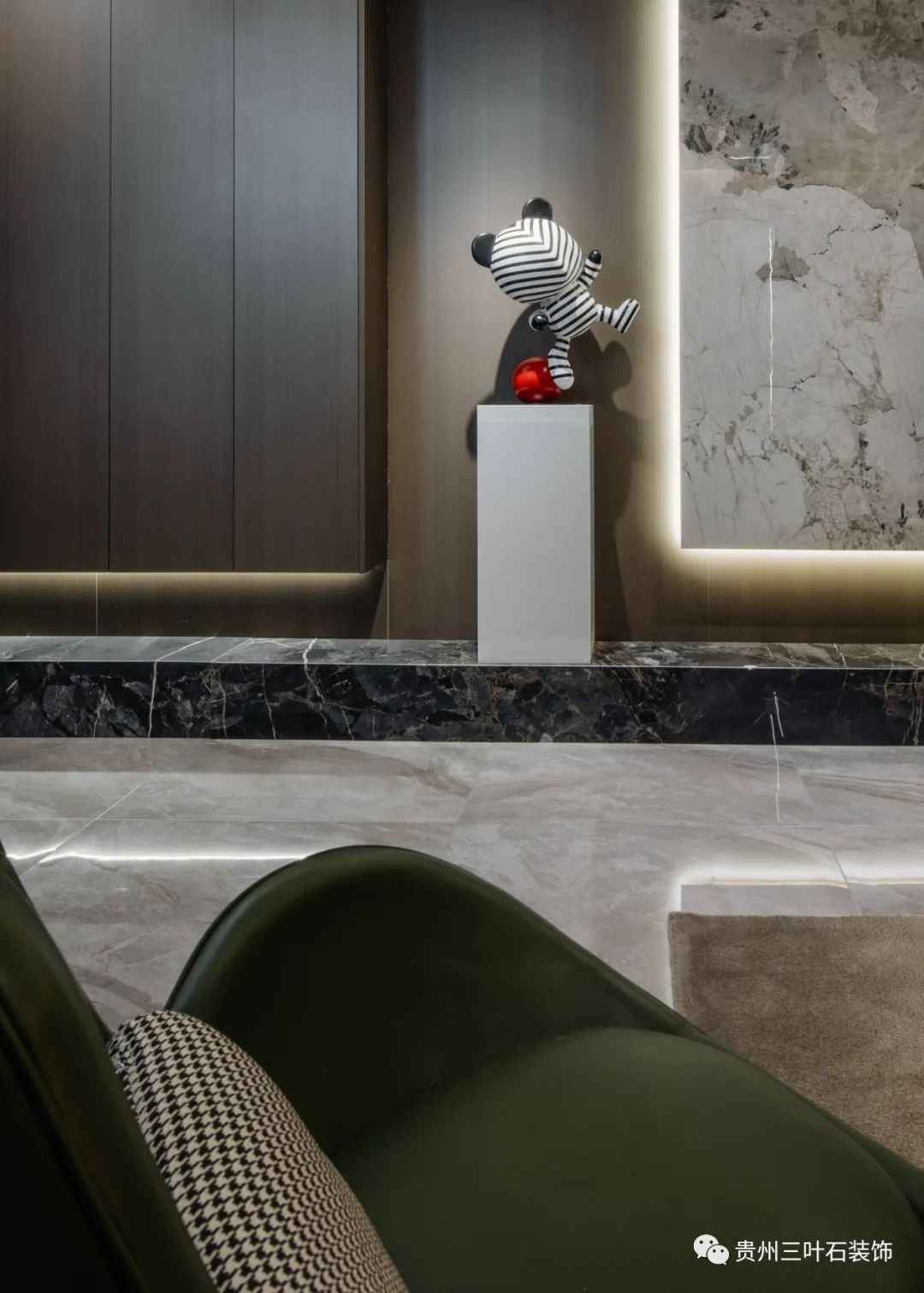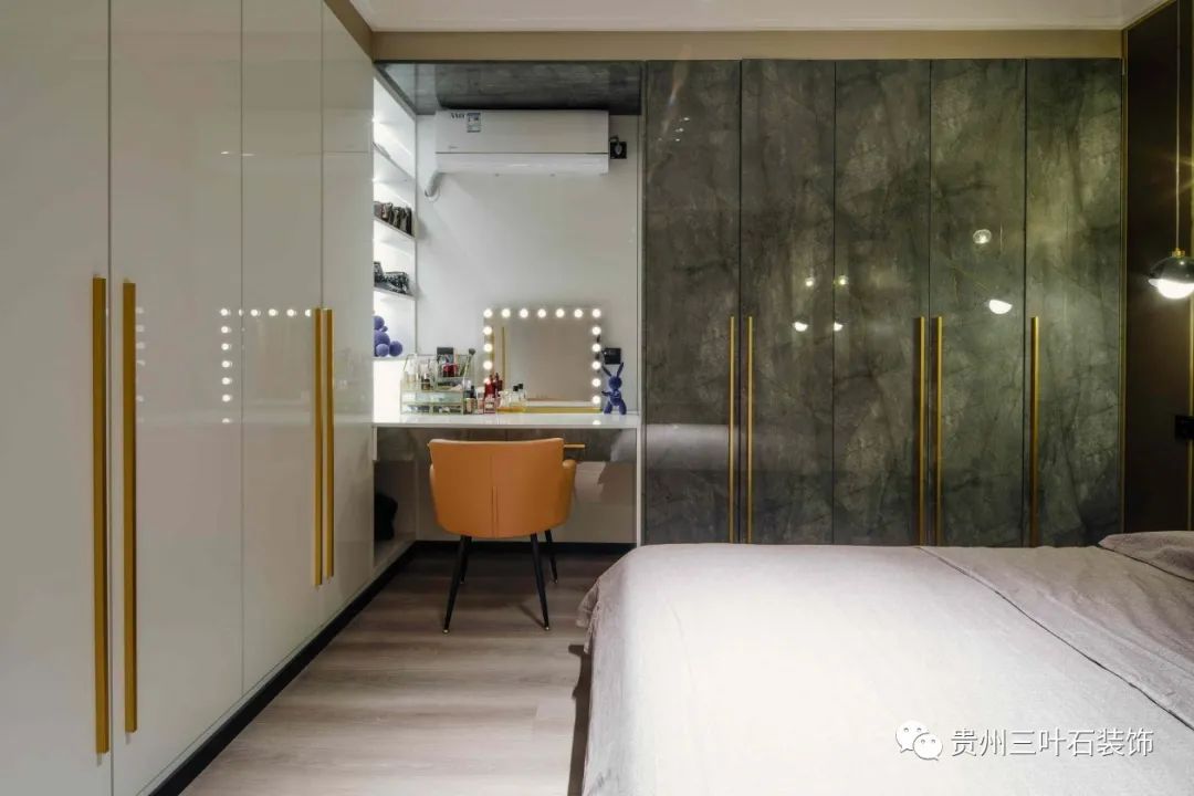 深棕色調木飾面與細膩的背景墻石材疊加,生成強烈的空間層次。同時在下面增設收納地臺,兼顧儲物功能。吊頂里隱藏的無主燈燈光順著墻面灑下來,光影與木質、石材交錯共生,沉浸式的氛圍感撲面而來。給整體空間增加了層次感與立體感,在現(xiàn)代簡約主義空間中流露出寫意之美,素淡而簡雅。